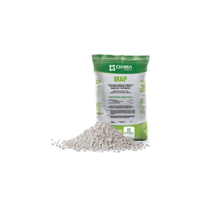 El MAP CIAMSA (fosfato monoamónico) es un fertilizante fosfatado de alta pureza que aporta fósforo (P) y nitrógeno (N) en una formulación balanceada, típicamente 11–52–0, ideal para etapas de establecimiento y desarrollo temprano de los cultivos.