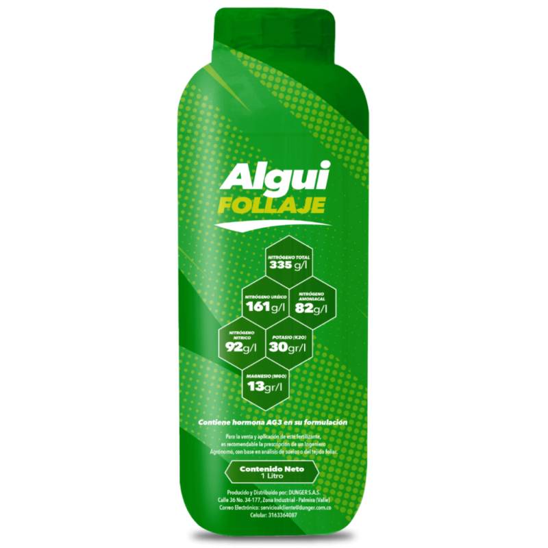 Alguifollaje es un fertilizante liquido con altos contenidos de nitrógeno en sus tres formas químicas (ureico, nítrico y amoniacal), además de potasio y magnesio, garantiza un mejor desarrollo vegetativo y mejor calidad de hojas lo cual se traduce en que ayuda a incrementar la tasa fotosintética con la cual incrementamos los rendimientos de los cultivos. Contribuye con la síntesis enzimática y clorofila.