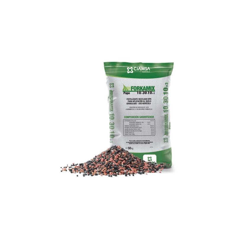 El FORKAMIX® 10-30-10 es un fertilizante compuesto NPK formulado con una alta proporción de fósforo (P₂O₅), acompañado de niveles balanceados de nitrógeno (N) y potasio (K₂O), diseñado para optimizar el arranque, establecimiento y desarrollo inicial de los cultivos.