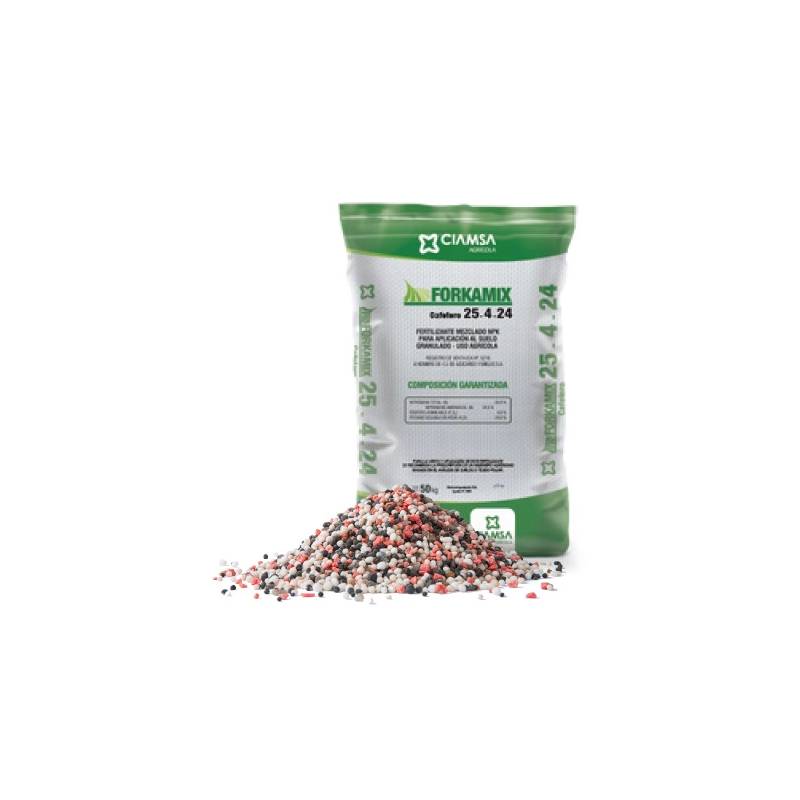 El FORKAMIX® 25-4-24 es un fertilizante compuesto NPK de alta concentración, formulado para suplir de manera eficiente las necesidades nutricionales de los cultivos en etapas de crecimiento activo y alta productividad, donde se requiere un aporte elevado de nitrógeno y potasio, con un complemento moderado de fósforo.