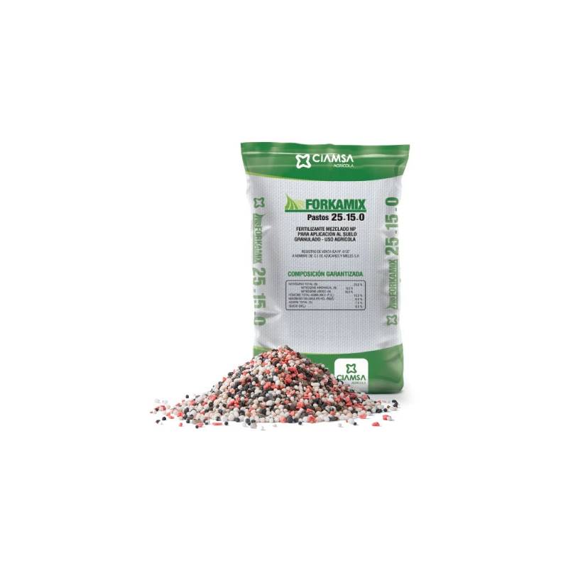 El FORKAMIX® 25-15-0 es un fertilizante compuesto NP, formulado para aportar altas concentraciones de nitrógeno (N) y fósforo (P₂O₅), sin potasio, orientado a cubrir las necesidades nutricionales de los cultivos en etapas de establecimiento y crecimiento vegetativo activo, especialmente en suelos con adecuada disponibilidad de potasio.